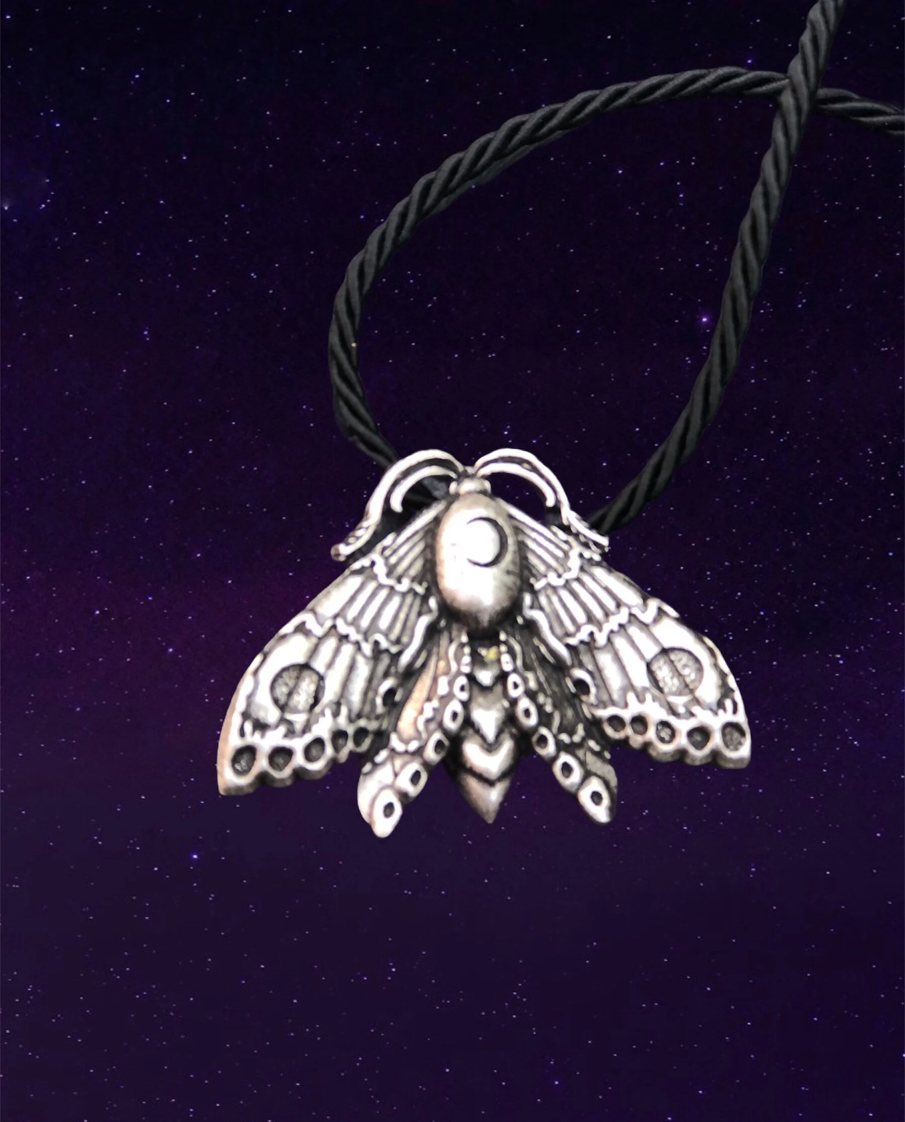 Crescent moon moth necklace. Necklace with black rope chain included.