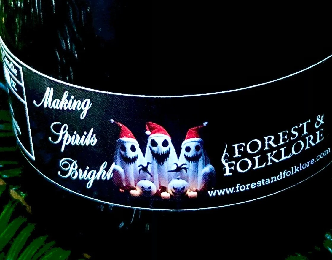 The Making Spirits Bright coconut soy candle is made with a cotton wick and natural fragrance oils. The label features 3 spooky spirits wearing Santa hats above white pumpkins.